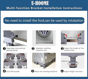 - The washing machine base is adjustable between 41-64cm in length and width and 9-12cm in height. It is a telescopic base that can be adjusted vertically and horizontally to suit different sizes of washing machines